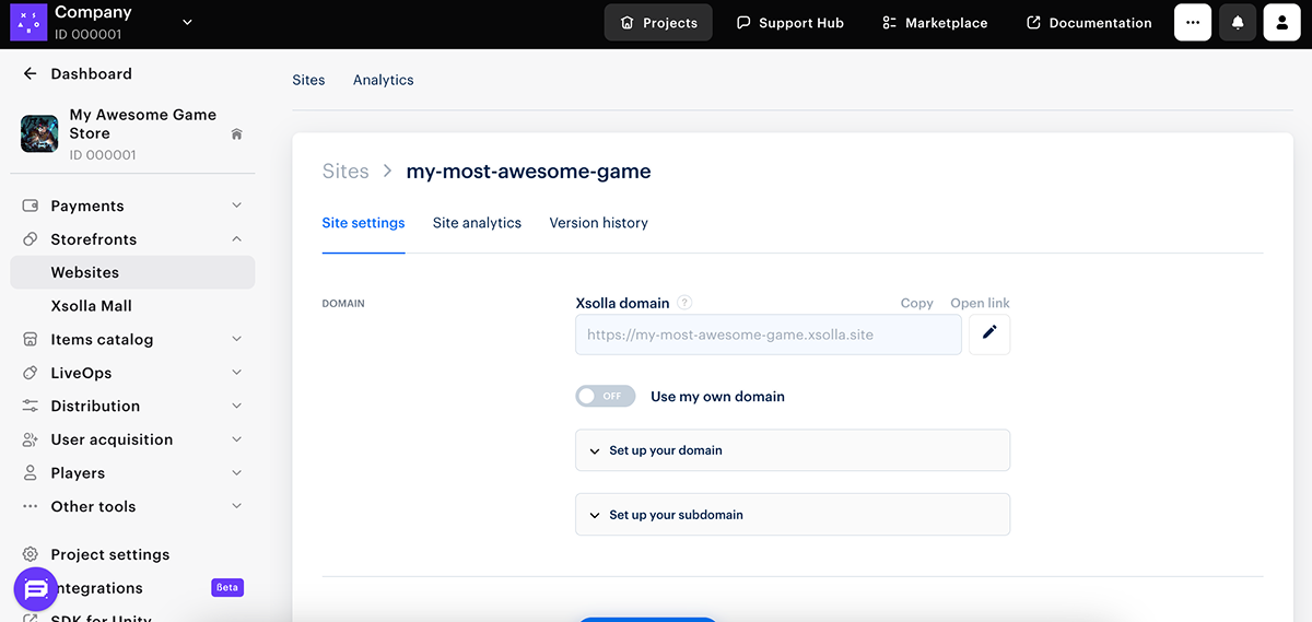 - Make changes to the domain (optional). To do this, go to Storefronts > Websites and click Configure. In the Domain section, edit the Xsolla domain name or use your own domain.
