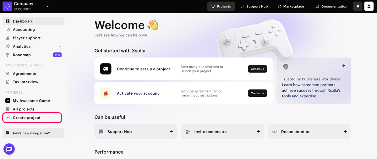 If you have multiple games or products, create a separate project for each. To do this, on the company page, in the side menu, click Create project and specify the necessary information.