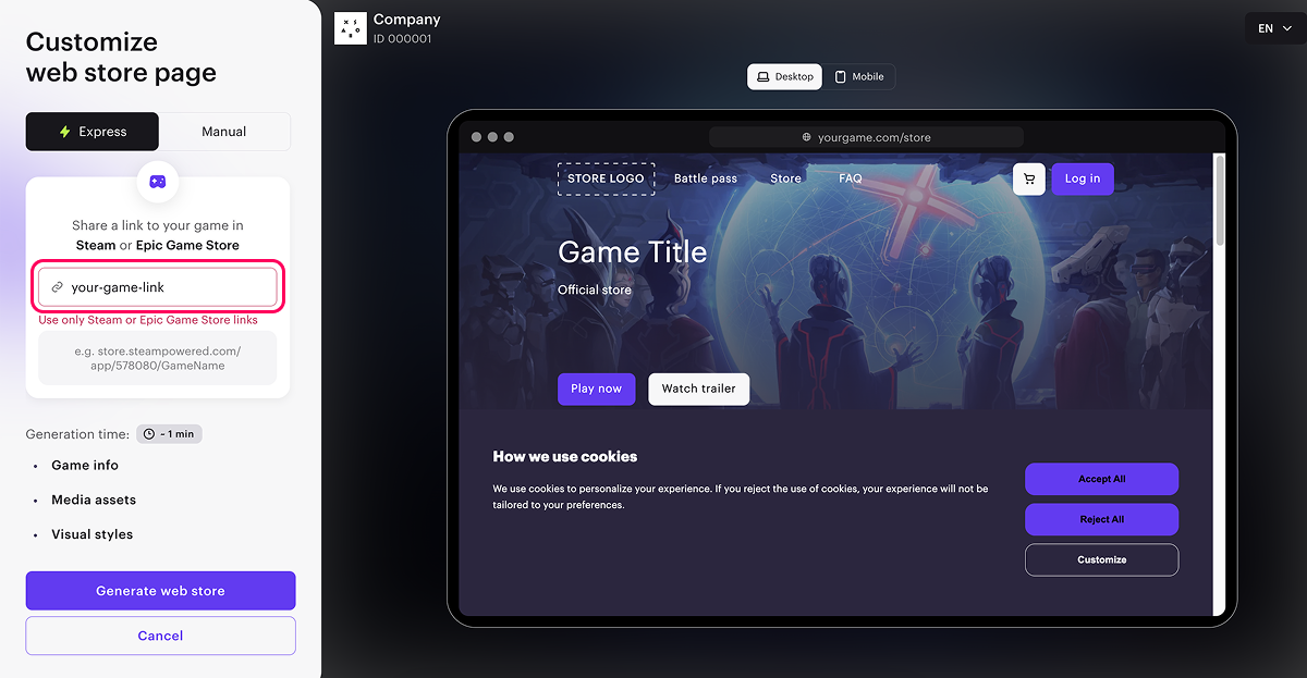 - On the Express tab, add a link to the platform where your game is available — Steam or Epic Games Store. This allows you to quickly create a site in the style of your game: images and the game title, developer information, and a color scheme are automatically added to the site.