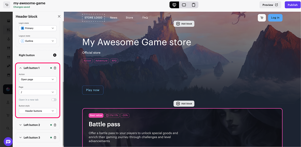 - If needed, add additional pages to your store, e.g., with the latest game news. To do this: