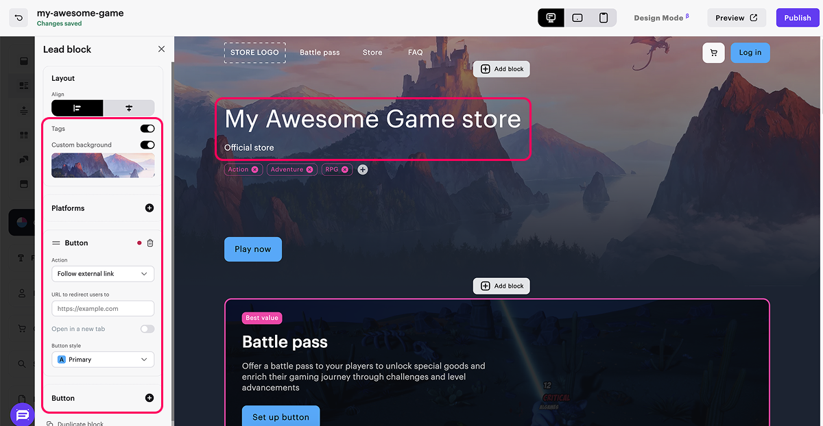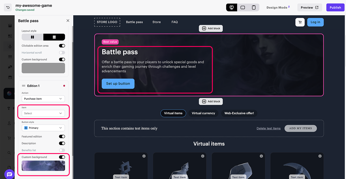 - Configure the Store block, where virtual items, bundles and virtual currency packages available for purchase are displayed: