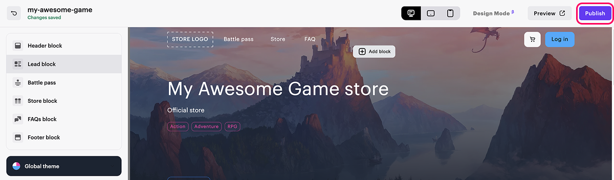 - After you made all necessary changes and your web store is ready for launch, in the upper-right corner of the site builder, click Publish.
