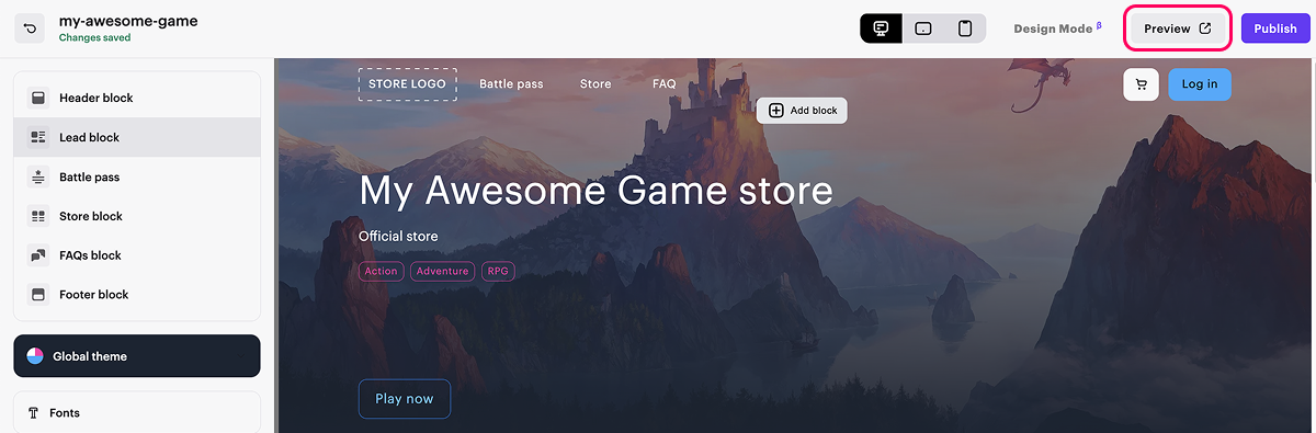 - On the project main page, in the Sell virtual goods in-game or online focus, go to the Optional: Set up a web storefront step, and click Customize site. You will be redirected to the site builder, where you can customize the created site.