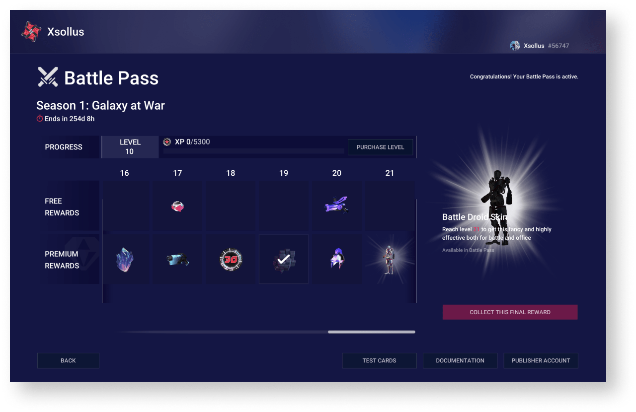演示项目提供了使用艾克索拉产品实现战斗通行证的示例。要试用战斗通行证: