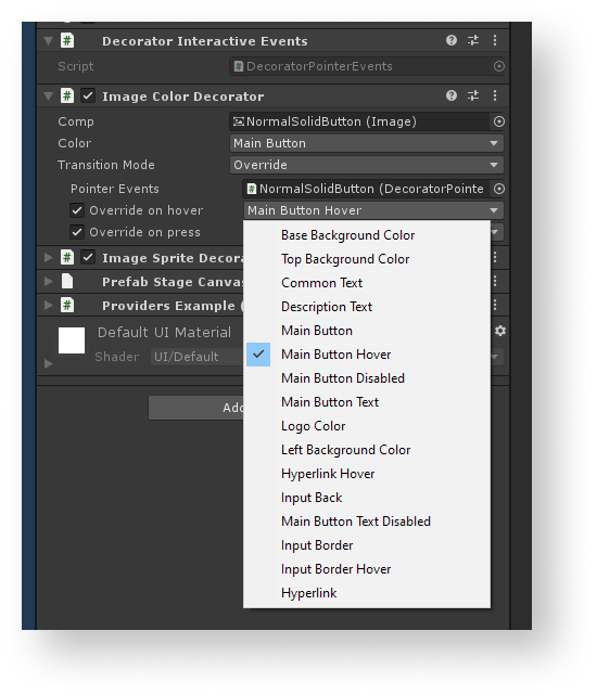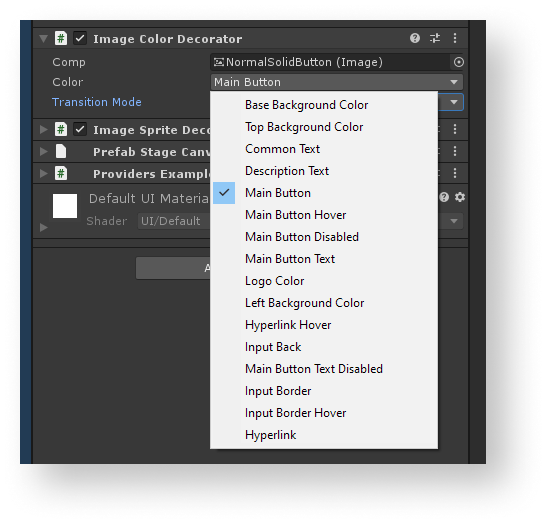 Theme— 主题组件。可通过主题更改UI的视觉效果。主题代表不同属性组合(颜色、精灵和字体)的集合。每个主题有一个名称和一个唯一标识符。您可以使用属性的ID访问主题属性。ThemesLibrary— 项目中存在的所有主题的库。它还包含当前主题的值,并提供更改该值的方法。ThemeDecorator— 引用主题属性并将属性值应用至标准Unity UI组件的MonoBehaviour类组件。例如ImageColorDecorator修饰器可更改图片颜色。UIPropertyProvider— 授予主题属性访问权限的类。使用这些组件可以轻松将用户代码与主题数据关联。例如ColorProvider类用于向数据提供颜色。WidgetContainer— 用于更改整个小组件的MonoBehaviour类组件。WidgetsLibrary— 项目中存在的小组件集合。该组件包含所有小组件的列表并提供通过ID获取小组件的方法。