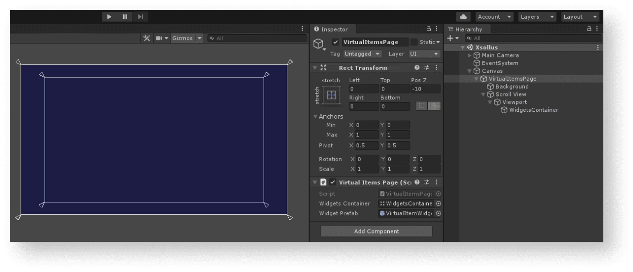 Inspector 面板中,单击Add Component ,然后选择一个VirtualItemsPage脚本。