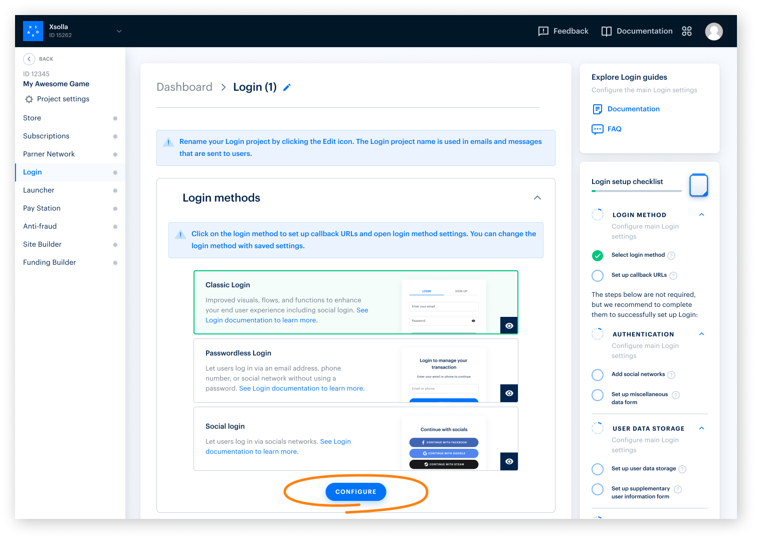 - 在导航页登录方法部分选择最符合游戏需求的方法,然后单击配置。