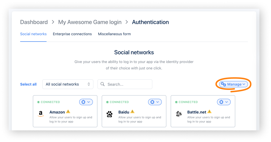 - 要一次性连接所有可用的社交网络,请单击全选,然后从管理下拉菜单中选择连接。
