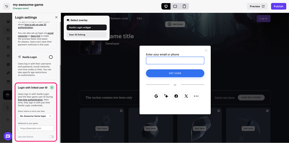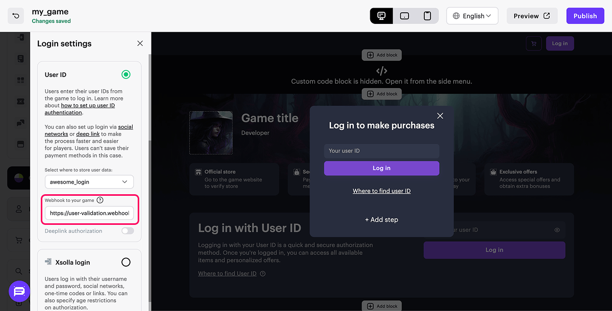 - 让您能够将艾克索拉登录管理器的安全性与使用游戏用户ID的优势相结合。艾克索拉登录管理器小组件独立于游戏客户端运行⸺与游戏的集成通过Webhook处理。关联的用户ID用于快速向游戏中的用户发放购买项并提供个性化优惠。