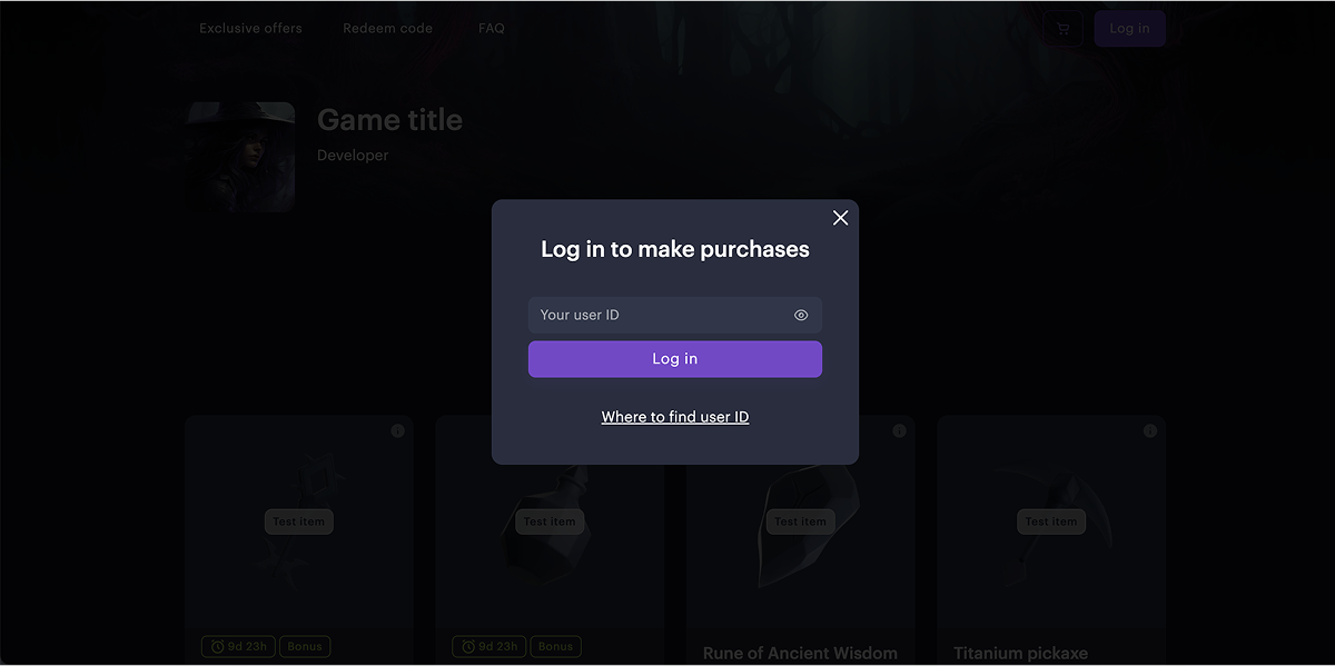 - 网页商城中的未授权用户点击登录按钮或购买按钮。随后将打开一个用于输入用户ID或通过移动游戏登录的模态窗口。