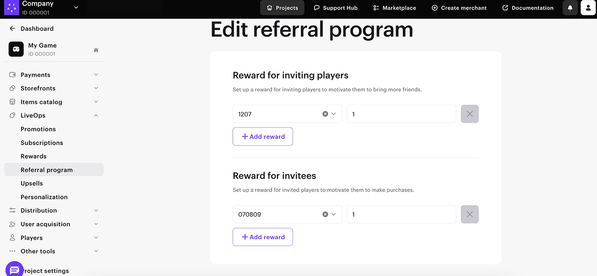 - 在发布商帐户中打开您的项目,前往LiveOps > 推荐计划部分。